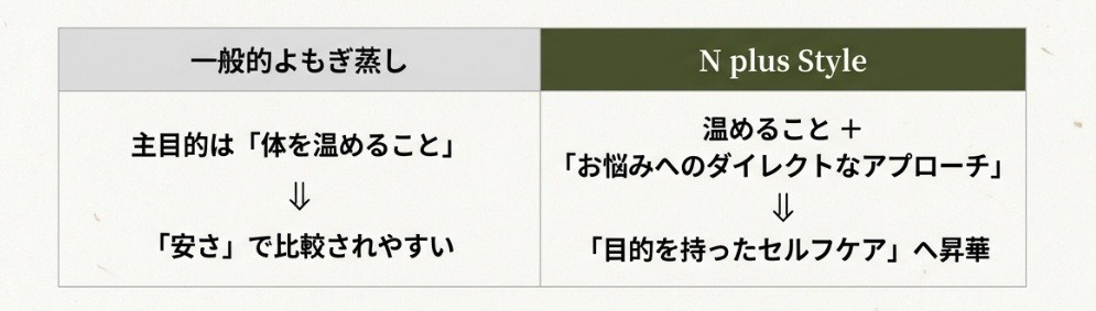 一般的なよもぎ蒸しは「体を温めること」が主目的です。もちろんそれだけでも素晴らしいのですが、それだけでは「安さ」や「通いやすさ」で比較されてしまいます。