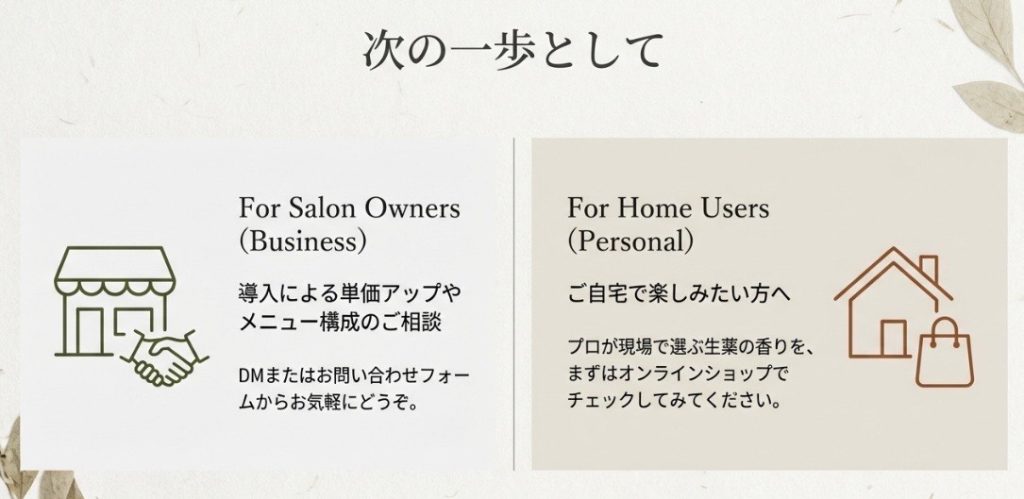 N plusの生薬は、厳選された素材を独自の視点でブレンドしています。この「ここでしか受けられない体験」こそが、価格競争に巻き込まれないための最大の防衛策になります。