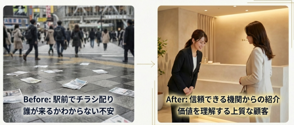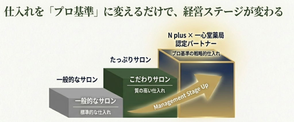駅前で不特定多数にチラシを配る必要はありません。 N plusと契約し、一心堂薬局のネットワークを活用することは、「あなたのサロンの価値を理解してくれる上質なお客様」への最短ルートを手に入れることでもあります。