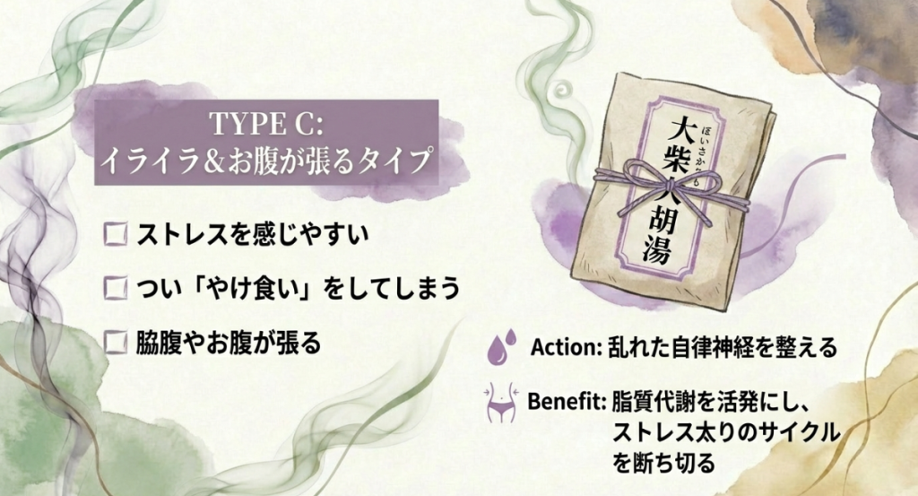 ストレスでつい「やけ食い」してしまうあなたには、「大柴胡湯(だいさいことう)」。 乱れた自律神経を整え、脂質代謝を活発にすることで、ストレス太りのサイクルを断ち切ります。