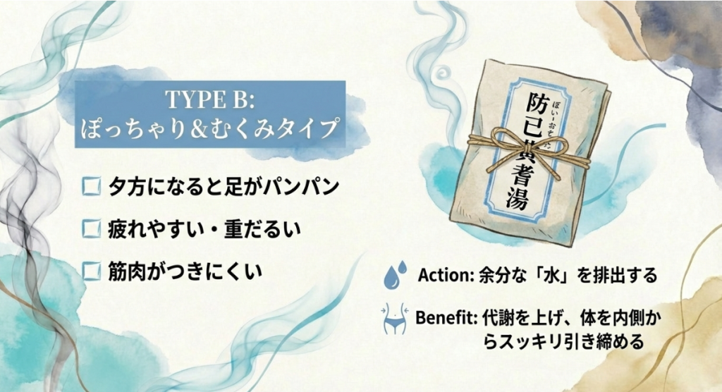 夕方になると足がパンパン、疲れやすいあなたには、「防已黄耆湯(ぼういおうぎとう)」。 余分な「水」を排出し、代謝を上げることで、体を内側からスッキリ引き締めます。